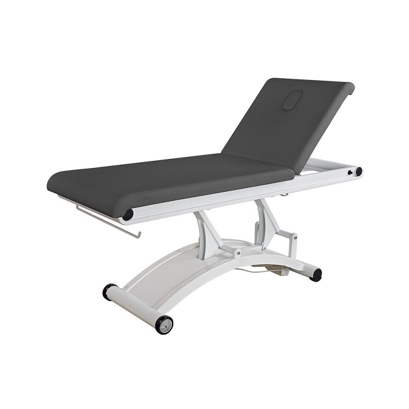 Wyposażony w 1 silnik kontrolujący wysokość. Oparcie regulowane jest za pomocą podnośnika gazowego. Silna zakrzywiona metalowa podstawa z 2 kółkami zapewnia łatwą mobilność. Biała tapicerka PU wysokiej jakości stanowczo ułatwia czyszczenie. Otwór na twarz przydatny przy zabiegach, w których pacjent leży na brzuchu.