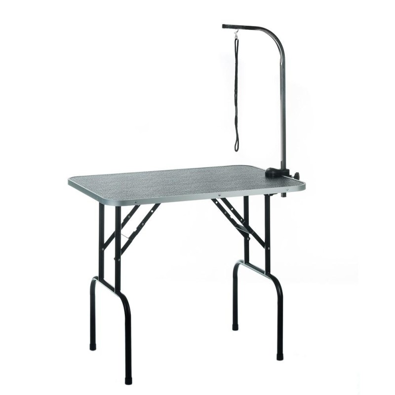 Stół groomerski do pielęgnacji zwierząt rozmiar L. Niezwykle stabilny blat pokryty matą antypoślizgową w kolorze czarnym. Rama aluminiowa w kolorze czarnym. Stół bardzo łatwy do złożenia, dzięki czemu może być używany przy mobilnej pracy z pupilami. W zestawie regulowane na wysokość ramię ze smyczą.