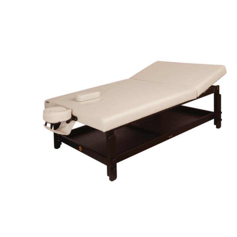 Solidność polskiej produkcji: Wykonany z litego buku, ten stół do masażu gwarantuje solidność i trwałość. Całość wzmocniona potrójnymi mocowaniami i wytrzymałą płytą meblową, zapewniając uczucie stabilności porównywalne do masażu na macie.