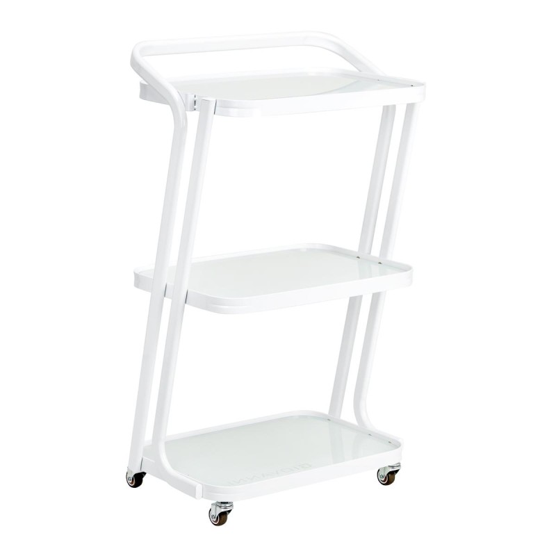 Prosta konstrukcja, stelaż z trwałego aluminium w odcieniach bieli oraz szklane półki sprawiają, że stolik jest zarówno estetyczny, jak i łatwy do utrzymania w czystości. Cztery kółka pozwalają na swobodne przestawianie, co znacząco ułatwia pracę w salonie, a solidne materiały gwarantują długotrwałą wytrzymałość i stabilność. Eleganckie wykończenie oraz ciekawie nachylony stelaż dodają mu wyjątkowego wyglądu, podnosząc estetykę każdego wnętrza.