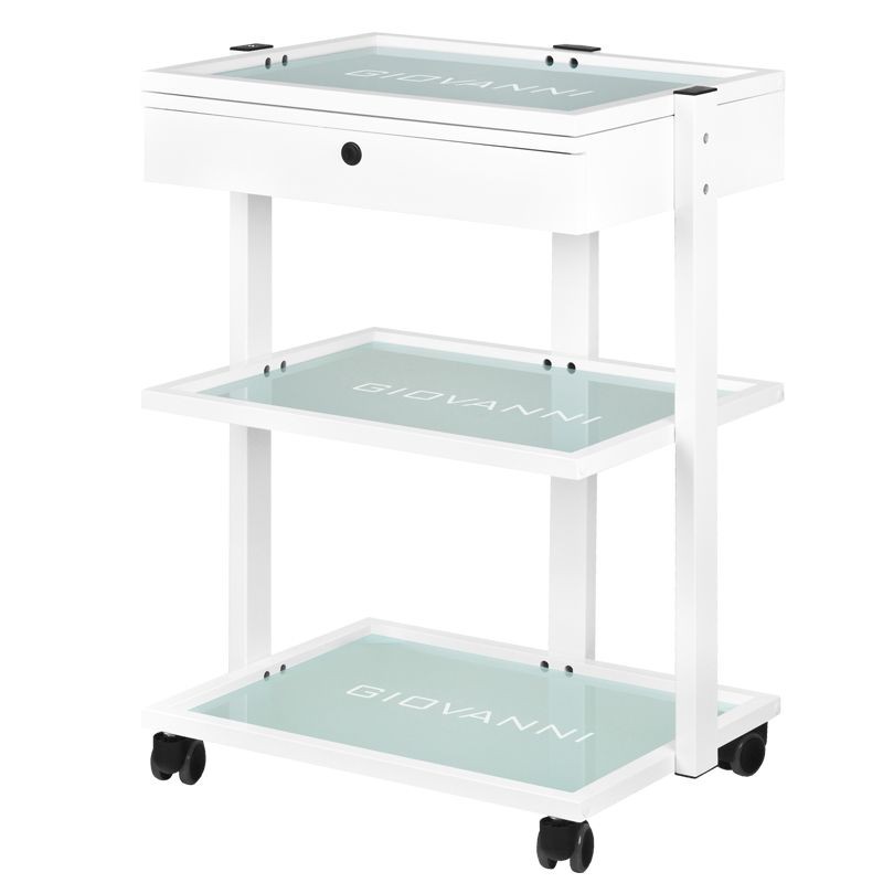 Elegancki metalowo-szklany stolik, na gumowych kółkach. Stolik posiada pojemną szufladę i dwie szklane półki z grawerowanym logo firmy GIOVANNI. Istnieje możliwośc przymocowania do stolika lampy-lupy.