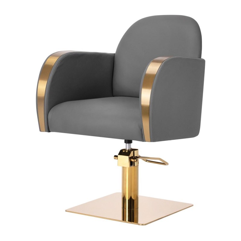 Fotel fryzjerski Malaga w eleganckim połączeniu złota i szarości to idealny wybór dla profesjonalnych stylistów.