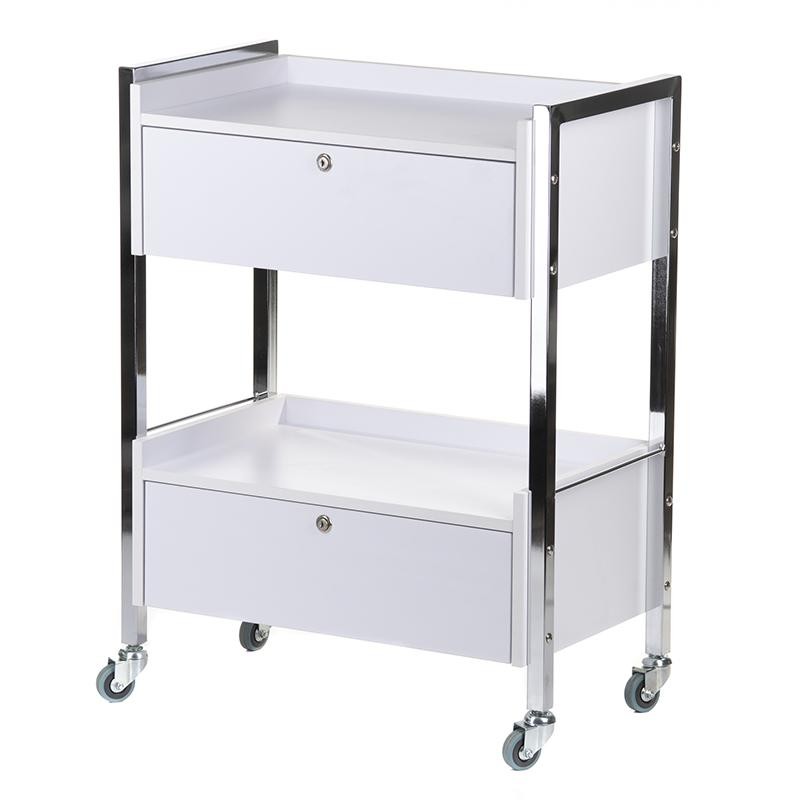 Oferowana szafka kosmetyczna jest wykonana z metalu i drewna, szerokie półki oraz mobilność zapewniają komfortową eksploatację.