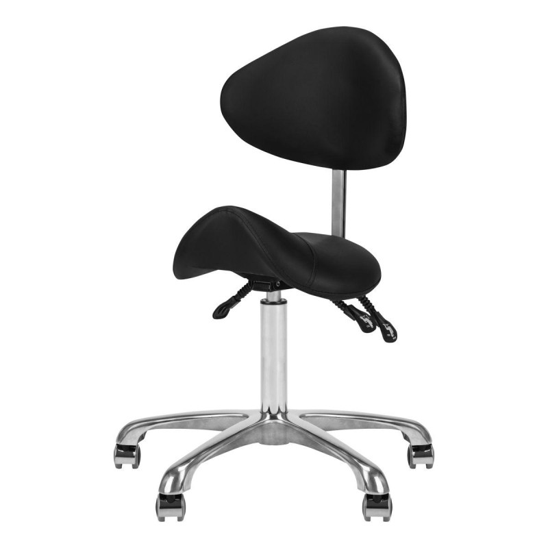 Wygodny, ekskluzywny , stabilny taboret kosmetyczny z oparciem oraz profilowanym siedziskiem, na pięcioramiennej bardzo stabilnej podstawie podstawie. Regulowany w trzech płaszcztznach:- pełna regulacja kąta nachylenia siedziska - pełna regulacja wysokości oparcia