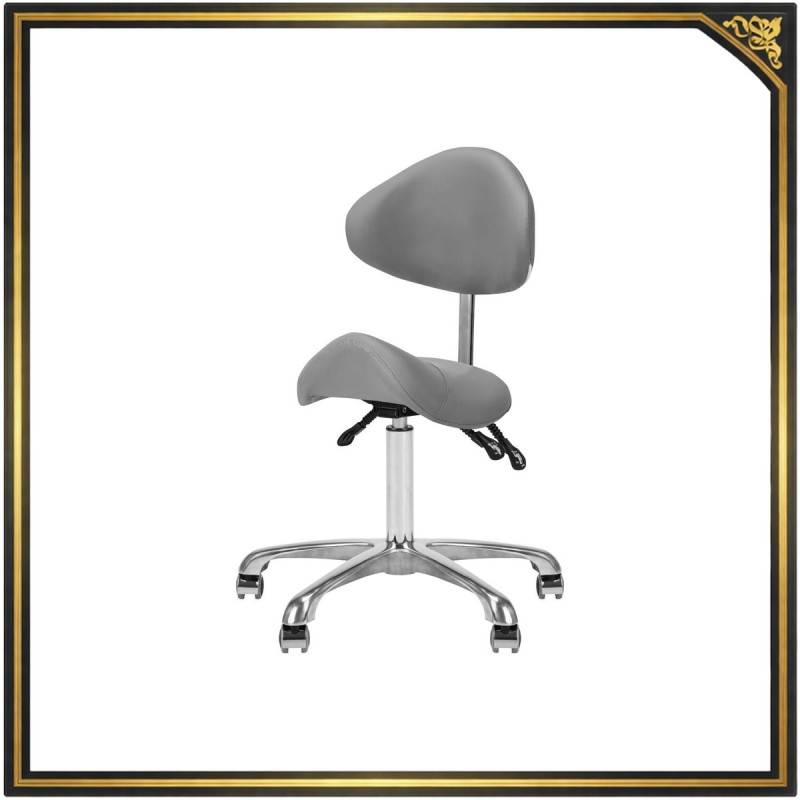 Wygodny, ekskluzywny , stabilny taboret kosmetyczny z oparciem oraz profilowanym siedziskiem, na pięcioramiennej bardzo stabilnej podstawie podstawie. Regulowany w trzech płaszcztznach:- pełna regulacja kąta nachylenia siedziska - pełna regulacja wysokości oparcia