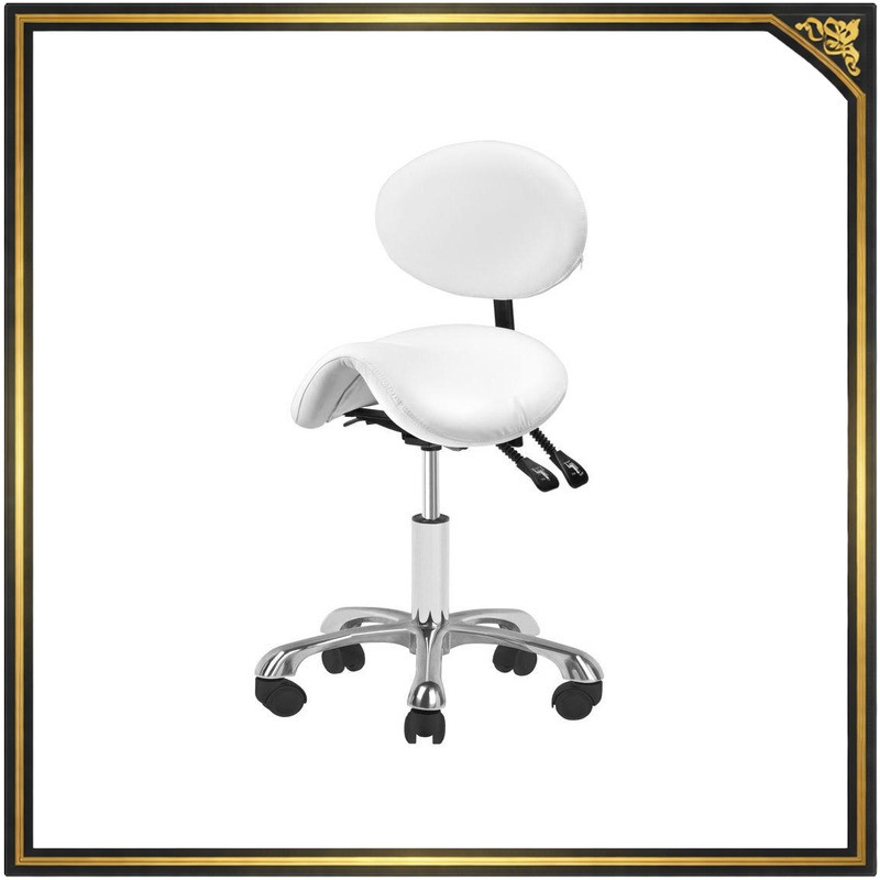 Wygodny, ekskluzywny , stabilny taboret kosmetyczny z oparciem oraz profilowanym siedziskiem, na pięcioramiennej bardzo stabilnej podstawie podstawie - pełna regulacja kąta nachylenia siedziska - pełna regulacja wysokości oparcia dostępne kolory - biały