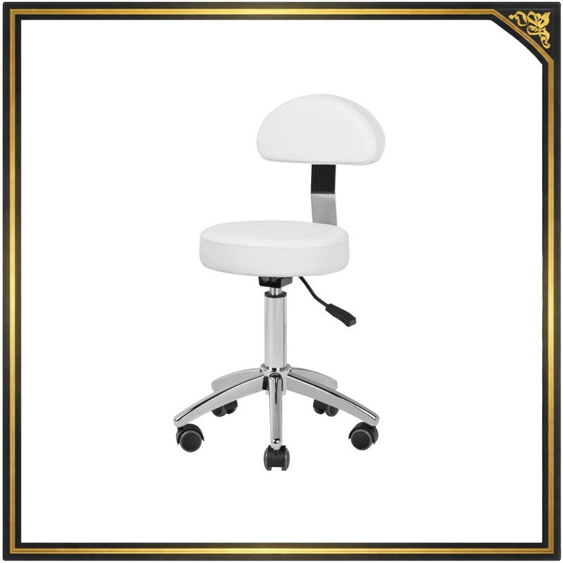 Wygodny taboret kosmetyczny, stabilny na pięcioramiennej podstawie, z gumowanymi kółkami, z możliwością demontażu oparcia, w kolorze białym, niezbędny mebel w gabinecie kosmetycznym.