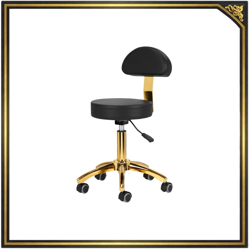 Pięcioramienna podstawa zapewnia stabilność oraz poczucie bezpieczeństwa, nawet podczas bardziej dynamicznych ruchów i częstych zmian pozycji. Wyposażenie w wytrzymałe koła zapewnia wysoką mobilność, co pozwala na swobodne przemieszczanie się po salonie czy gabinecie. Obicie ze skóry syntetycznej w odcieniach czerni, które jest nie tylko trwałe, ale także łatwe do utrzymania w czystości. Estetyczne obszycia i pikowanie nadają mu wyjątkowy wygląd, a złote elementy ozdobne dodają luksusowego charakteru, który przyciąga uwagę. Wyjątkowe połączenie elegancji oraz komfortu czyni taboret niezastąpionym narzędziem w pracy każdego profesjonalisty.