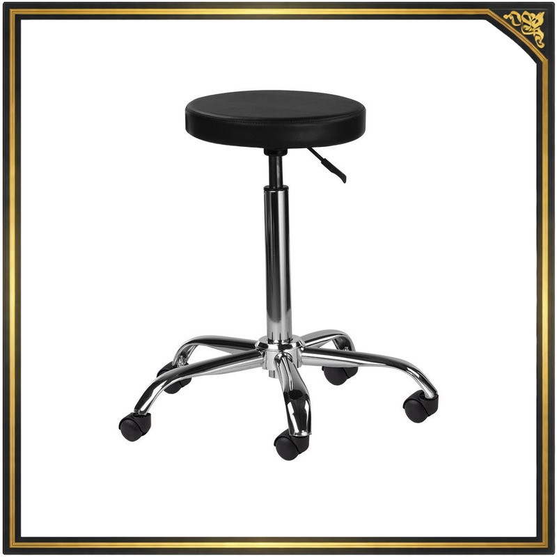 - Kółka z kauczuku — nie rysują podłogi i poruszają się cicho, co ułatwia przestawianie taboretu bez zakłócania pracy salonu.