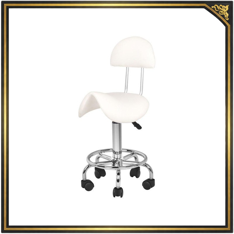 Wygodny, stabilny taboret kosmetyczny z oparciem, z profilowanym siedziskiem, na pięcioramiennej podstawie z plastikowymi kółkami. Dostępny w kolorze BIAŁYM, niezbędny mebel w gabinecie kosmetycznym.