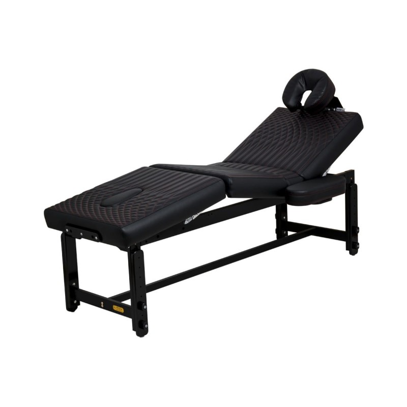 Cztero-sekcyjny układ powierzchni roboczej umożliwia ułożenie klienta w pozycji na brzuchu, uniesienie podudzia, pięty jak również pozycji półsiedzącej z łatwym dostępem do ramion, przedramion, klatki piersiowej, stóp. Tapicerka Comfort Plus zapewnia najwyższy poziom komfortu przy bardzo długich sesjach. Wykończenie stołu w deseniu Dark Red Arc wpisuje się idealnie w przestrzeń salonu tatuażu i piercing?u nadając mu unikalny, wysmakowany charakter.