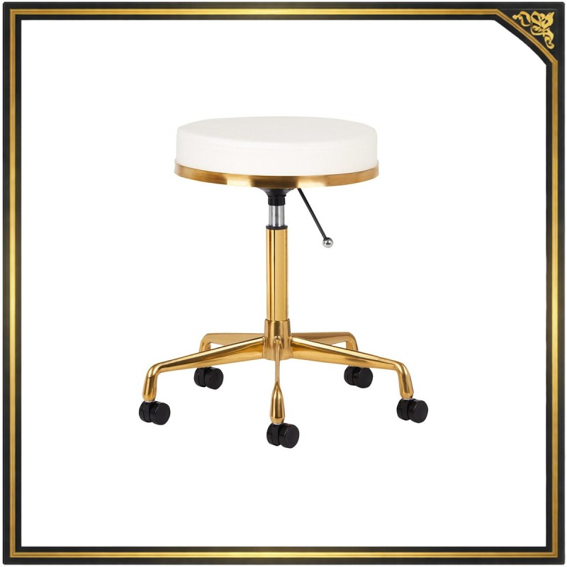 Złoty Taboret Kosmetyczny Obrotowy łączy elegancki wygląd z wygodą pracy. Idealny do salonów profesjonalnych oraz do użytku domowego — kompaktowy, stabilny i łatwy w obsłudze.
